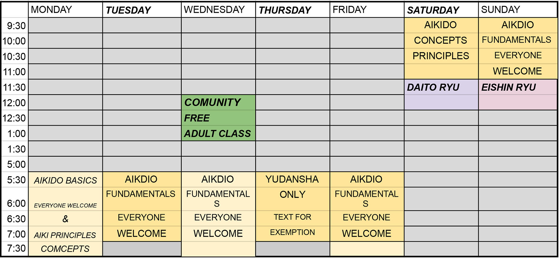 These classes are designed for students with less experience. If you have never trained Aikido or any martial art before, these classes are the place to begin and grow. You are welcome however, to participate in other classes as well.